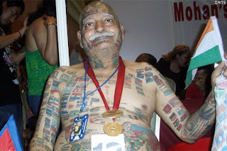 Harprakash Rishi known as Guinness Rishi, a Delhi-based Business Man and world record holder was carrying flags of 305 countries on their own body to promote friendship among nations. 165 mini map flags along with 2388 characters and a portrait of Jim Pattison on his hand. All these tattoos were carved on his body from July 15, 2009, to July 25, 2010.