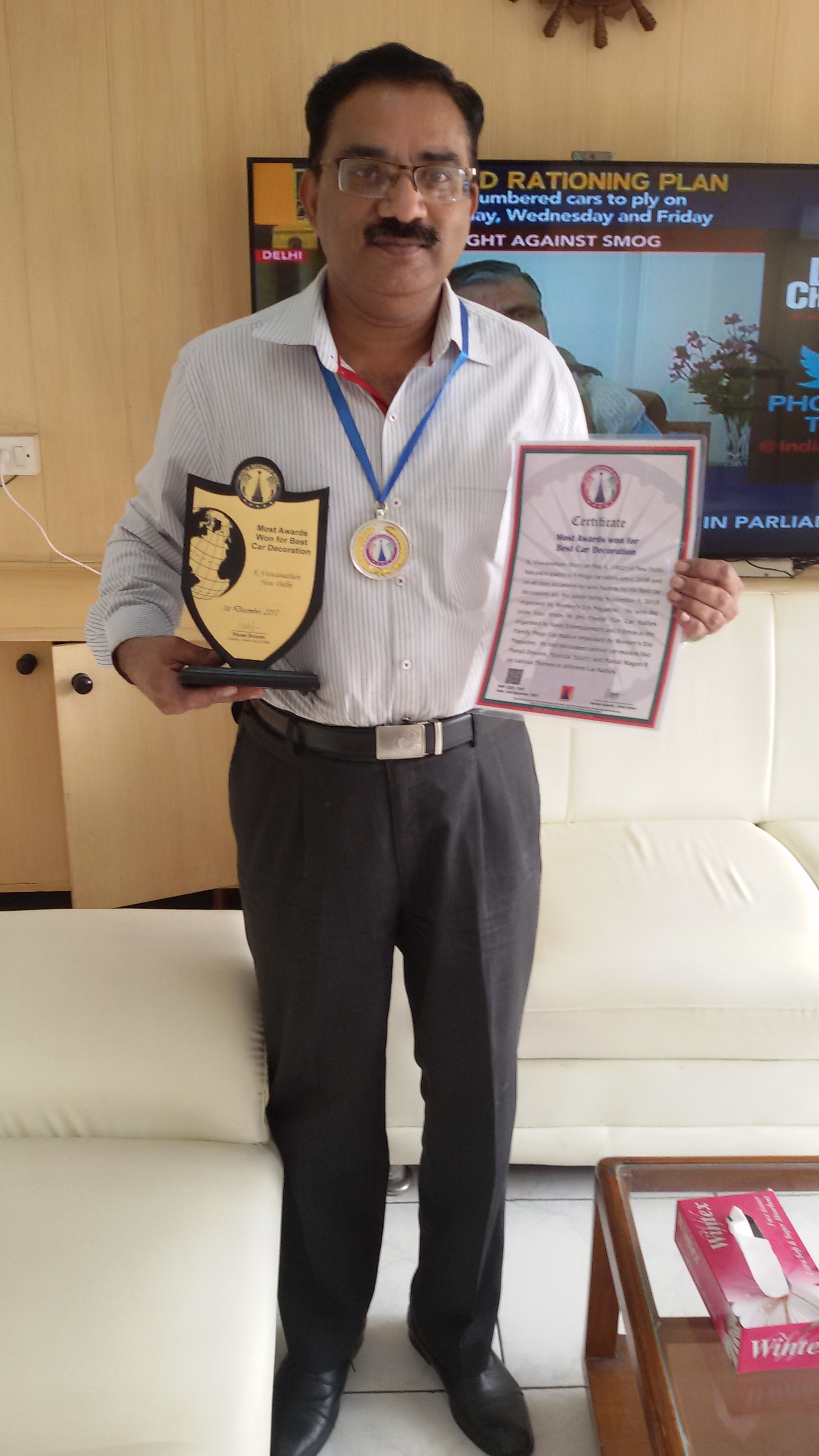 K. Viswanathan (Born on May 4, 1962) of New Delhi has participated in 9 Mega car rallies since 2008 and on all nine occasions he won Awards for his Best car decoration art, the latest being September 6, 2015 organised by Women’s Era Magazine. He won the prize four times in the Family Fun Car Rallies organised by Rashi Entertainment and 5 times in the Family Mega Car Rallies organised by Women’s Era Magazine. He had decorated various car models like Maruti Esteem, Hyundai Santro and Maruti Wagon R on various Themes in different Car Rallies.