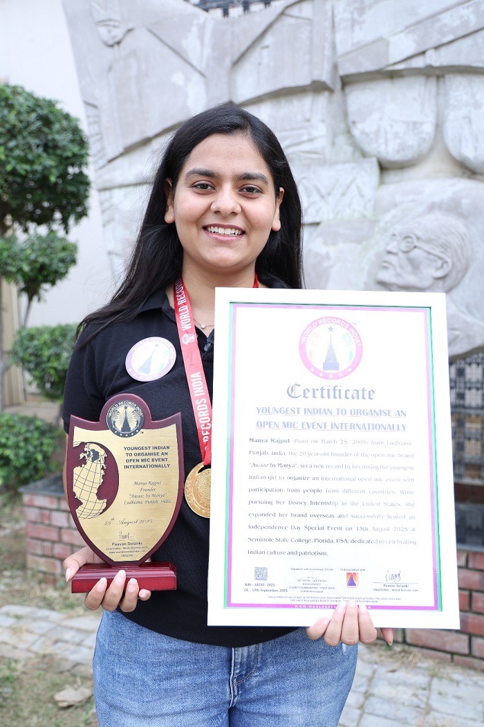 Manya Rajput (Born on March 25, 2005) from Ludhiana, Punjab, India, the 20-year-old founder of the open mic brand “Awaaz by Manya”, set a new record by becoming the youngest Indian girl to organize an international open mic event with participation from people from different countries. While pursuing her Disney Internship in the United States, she expanded her brand overseas and successfully hosted an Independence Day Special Event on 15th August 2025 at Seminole State College, Florida, USA, dedicated to celebrating Indian culture and patriotism.