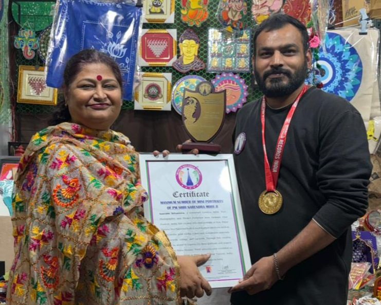 Saurabh Srivastava, a renowned Creative Artist, Poet, Photographer, and Theatre Performer from Varanasi, Uttar Pradesh, India, has created 250 mini-portraits of Hon. Prime Minister Shri Narendra Modi Ji using multiple mediums such as mixed media, print media, watercolor, sustainable materials, pens, pencils, collage, and cut-work. Through this creative journey, he aimed to express his deep gratitude and respect towards the Prime Minister. These artworks were exhibited on 17th September 2025 at FDDI, Noida, Uttar Pradesh, India, setting a New World Record with World Records India.